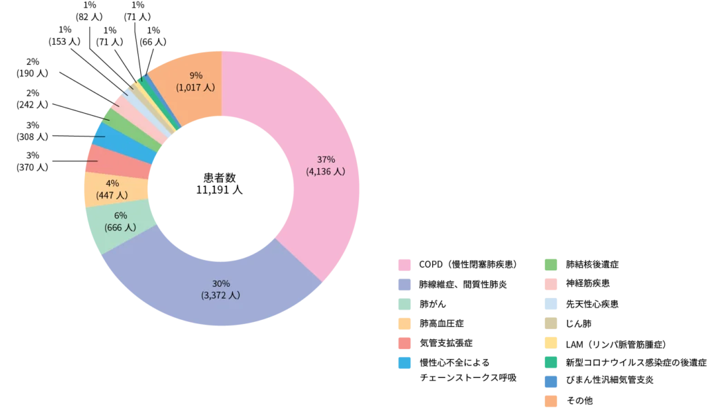 この治療法が用いられる疾患は多岐にわたり、最も多い順から、COPD(慢性閉塞性肺疾患)、肺線維症や間質性肺炎、そして肺がんとなっています。※2